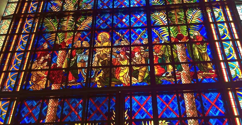 A hatalmas belteret mozaik-ablakok határolják, melyek a bibliából villantanak fel pillanatképeket kisebb-nagyobb helyi adoptációkkal; a szponzori megjelenítések a kereskedelmi tévékben mindig is viták tárgyát képezték, nos, itt ilyen kérdések valószínűleg fel sem vetődtek. Jézus színe előtt személyesen Boigny térdel (azért értékelendő, hogy nem fordítva), társaságában kétoldalt a további szponzorok. A Coca-Cola, a FIFA vagy az Apple ezesetben szerencsére nem képviseltette magát, ami komoly visszafogottságra vall részükről. Igen, létezik az a kifejezés, hogy ízléstelenség, de a diktátorok világában ez a szó szinte minden esetben a jelentését veszti.