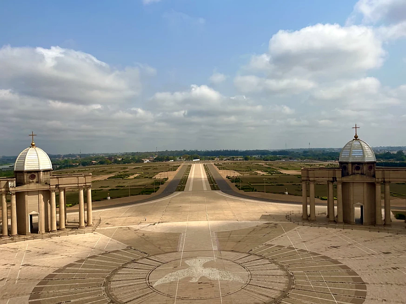 Az építkezés alapkövét II. János Pál pápa tette le 1985. augusztus 10-én, azaz az egyházat nagyon nem zavarta a nyomorgó ország szinte összes erőforrását felzabáló projekt. Az agyament projekt 1989. szeptemberben lezárult, 1990. szeptember 10-én fel is szentelte őfelsége a pápa. A templom egyébként igencsak hasonlít a vatikáni példaképére, 24 pillér tartja a hatalmas kupolát az egyterű épület fölött. Az oszlopok némelyikében liftek is találhatók, melyek persze az épület átadása óta nem üzemelnek.